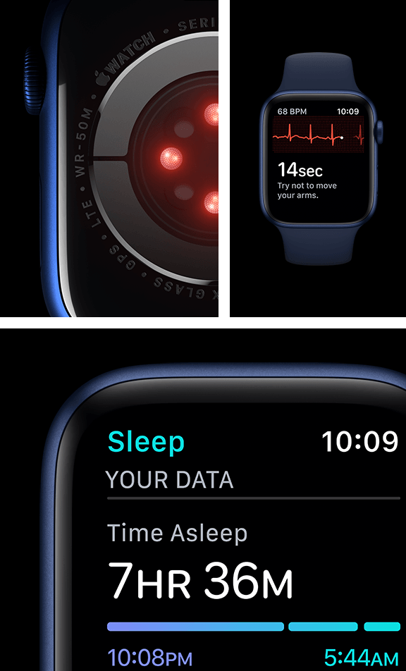 Mēri skābekļa daudzumu asinīs ar jaunu, revolucionāru sensoru un aplikāciju. Noskaidro savus fiziskās formas rādītājus ar vienu acu uzmetienu uzlabotajam Always-On Retina displejam. Kad uz rokas ir Apple Watch Series 6, ir daudz vieglāk dzīvot veselīgāk un aktīvāk un turēties sakaros.