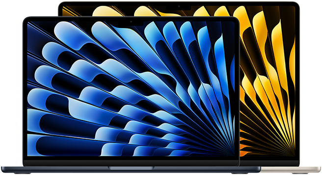 Displejs: Ekrāna lielums tiek mērīts pa diagonāli. Faktiskais 24 collu iMac ekrāna lielums pa diagonāli ir 23,5 collas. MacBook Air ar M1 čipu un 13 collu MacBook Pro displejs pa diagonāli ir 13,3 collas. 13 collu MacBook Air ar M2 vai M3, 15 collu MacBook Air un 14 collu un 16 collu MacBook Pro displeja augšējie stūri ir noapaļoti. Mērot kā standarta taisnstūri, ekrāna lielums pa diagonāli ir 13,6 collas, 15,3 collas, 14,2 collas un 16,2 collas (faktiskais apskatāmais laukums ir mazāks).